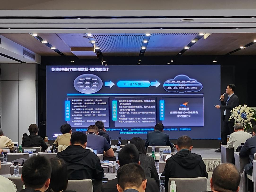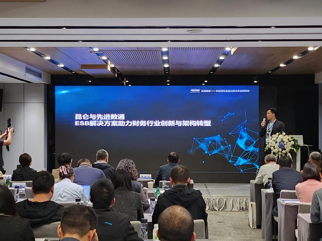 Ezpay代表讲师郭钰以《昆仑与EzpayESB解决方案助力财务行业创新与架构转型》为主题作发言分享。他深入剖析了当前财务行业IT架构面临的挑战,包括系统孤岛、技术老旧、扩展性不足等问题,并提出了基于企业服务总线(ESB)和微服务架构的转型方案。